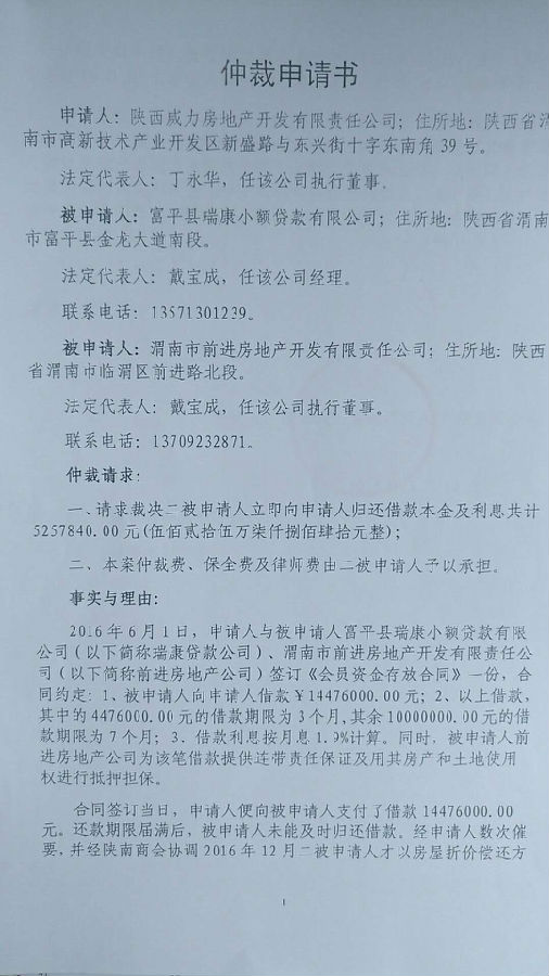 陜西威力房地產(chǎn)開發(fā)有限責(zé)任公司與富平縣瑞康小額貸款有限公司、渭南市前進(jìn)房地產(chǎn)開發(fā)有限責(zé)任公司一案公告