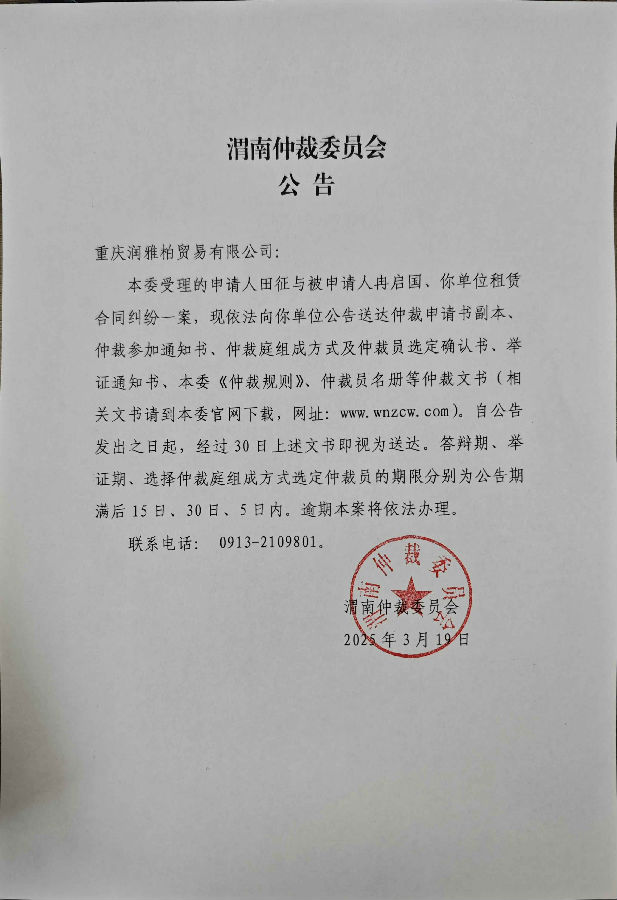 重慶潤雅柏貿易有限公司、冉啟國與田征租賃合同糾紛案公告